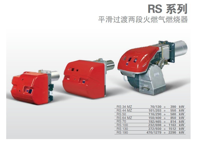 ?RS系列燃燒器的出力范圍為45~2290kW,適用于中低溫的熱水鍋爐、熱風(fēng)及蒸汽鍋爐和導(dǎo)熱油爐。 此系列燃燒器的運(yùn)行模式為“平滑兩段火”;燃燒器安裝有微處理器控制面板,可顯示運(yùn)行狀態(tài)及診斷故障原因。 風(fēng)機(jī)和燃燒頭性能的提升保證了燃燒器